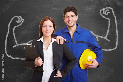 Junge Geschäftsfrau und Handwerker vor Tafel mit Muskel Armen
