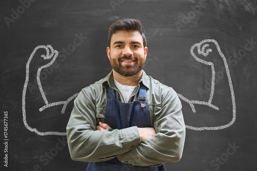 Selbstbewusster Handwerker mit Muskel Armen als Kompetenz Konzept