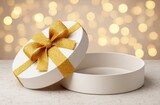White gift box with gold ribbon on beige background and warm bokeh lights for celebration