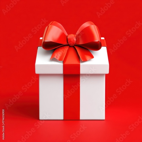 Elegant white gift box with red ribbon bow on a red background, perfect for gifts