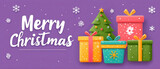 Colorful Christmas gift boxes with a festive tree on purple background