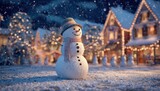 Cheerful snowman amid festive holiday lights on a snowy winter evening