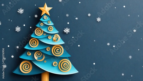 Blue Christmas tree with golden spirals and star topper in a snowy festive scene