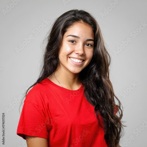 A cheerful Panamanian teenage girl smiling in a red shirt and long hair
