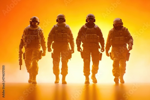 Four soldiers in full gear walk forward in a dramatic orange glow, showcasing teamwork and readiness