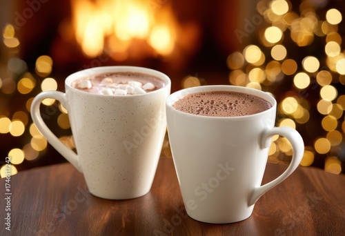 Cozy living room scene with two white mugs of hot cocoa by the warm fireplace with festive lights