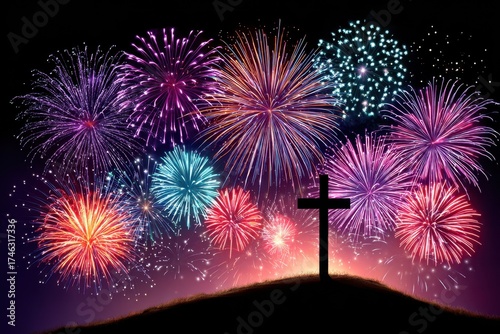 Cross on a hill under a vibrant fireworks display at night sky