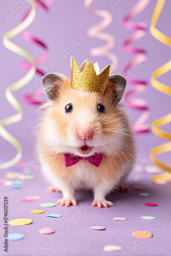 Cute guinea pig with crown and bow tie celebrating amidst colorful confetti
