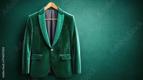Luxurious emerald velvet blazer on hanger with textured decorative background