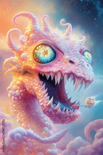 Fantastical space creature with galactic eyes in a colorful cosmic scene