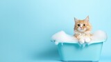 Adorable orange cat in bathtub with foam on light blue background