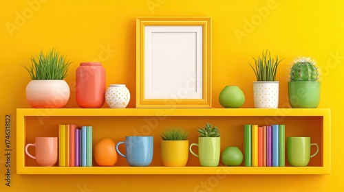 Colorful shelves with plants, books, mugs, and empty frame on yellow background