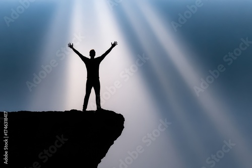Arty AI silhouette of a man standing on a cliff with his arms raised in triumph