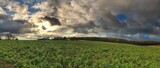 Wide panoramic view of a green field under a dramatic cloudy sky