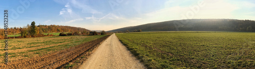 Panoramic view of a rural dirt road through open fields on a sunny day