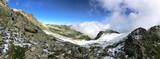 Panoramic view of a mountainous landscape with clouds and snow-covered terrains