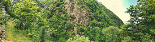 Panoramic view of lush green forest and rocky hillside with vibrant vegetation