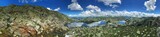 Panoramic mountain landscape with rocky terrain and alpine reflections under a vibrant sky
