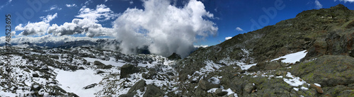 Panoramic alpine mountain view with snow, clouds, and blue sky