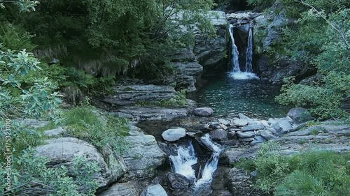 Scenic waterfall surrounded by lush green forest vegetation in natural environment