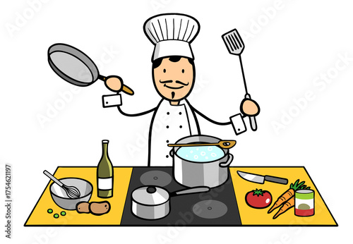 Cartoon Koch jongliert mit Töpfen und Pfannen