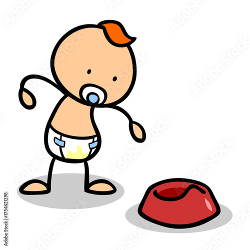 Cartoon Kleinkind steht mit nasser Windel vor Töpfchen