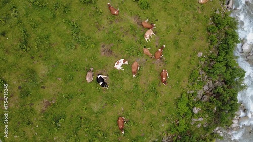 Summer Aerial View of Happy Cows Grazing by a Mountain Stream in the Austrian Alps.