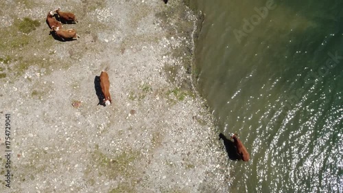 Summer Aerial View of Happy Cows Grazing by a Mountain Stream in the Austrian Alps.
