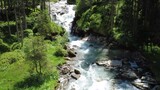 Drone View: Lush Green Austrian Alps with Serene Mountain River Flowing Through Valley in Summer.