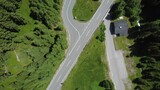 Aerial View of a Winding Mountain Road Through Dense Alpine Forest on a Sunny Day.