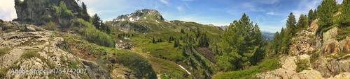 Panoramic view of lush alpine landscape with mountains and vibrant greenery