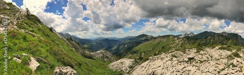 Panoramic mountain landscape with rocky terrain and vibrant greenery under a blue sky
