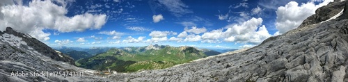 Panoramic mountain landscape with rocky terrain and vibrant greenery under a blue sky