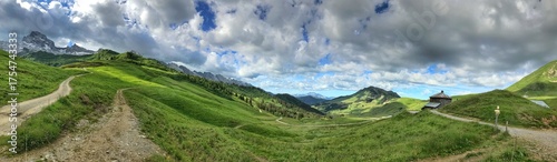 Panoramic view of lush green alpine landscape with mountains and cloudy sky