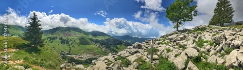 Panoramic mountain valley with lush greenery and blooming flowers in summer