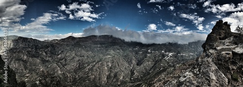 Panoramic view of mountainous landscape with dramatic clouds and rugged terrain