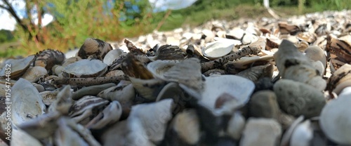 Panoramic view of a beach abundant with seashells scattered on the ground