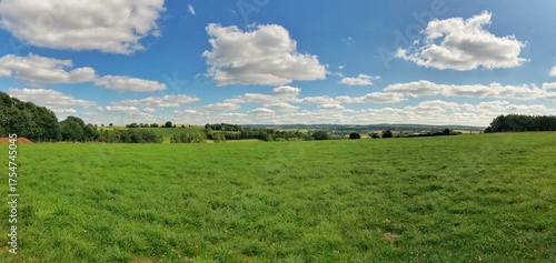Wide panoramic view of a grassy field under a vibrant blue sky