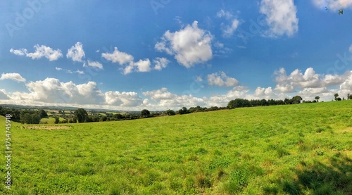 Wide countryside panorama with lush green fields under a blue sky