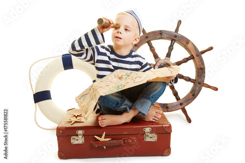 Kind als Matrose auf einem Koffer