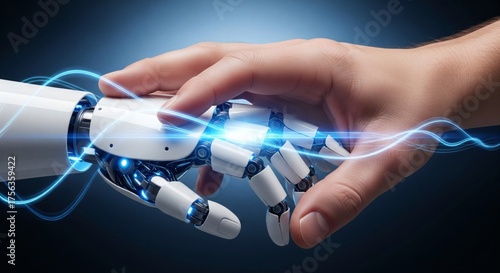 Human hand touching a white robotic hand, symbolizing artificial intelligence, collaboration, and future technology with blue digital light streams on a dark background. #1756359422
