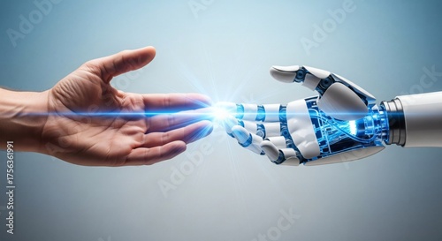 Human and robot hands connecting with a futuristic blue light spark, symbolizing artificial intelligence interaction and technological progress. #1756361991