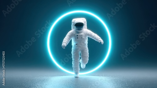 Astronaut stepping through a glowing neon circular portal in a dark futuristic space scene