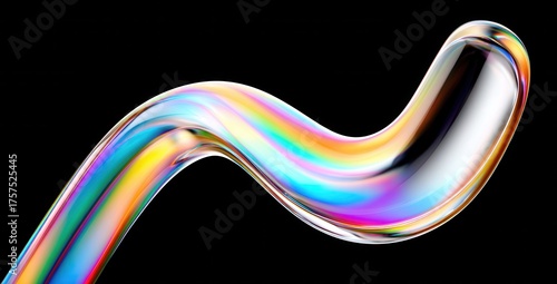 Iridescent curved glass ribbon with rainbow light on a black background, abstract sculpture and shine