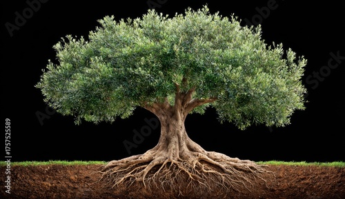 Majestic olive tree with thick roots on dark backdrop, lush leaves, and strong trunk
