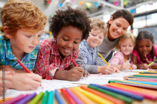 Group of children and their teacher drawing together at a table with colorful pencils in a bright classroom