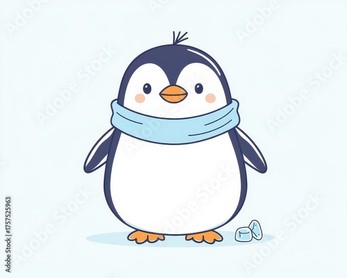 Cute penguin wearing a scarf standing with ice on a light background