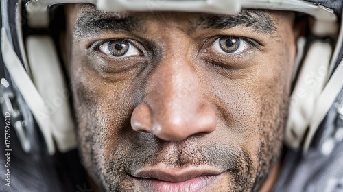 Athlete close-up portrait of a football player wearing a helmet with an intense focused gaze