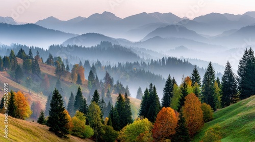 Misty autumn mountain landscape with pine forest at sunrise in Slovenian hills