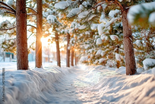 Serene winter path through snow-covered pines with sunrise glow in a quiet forest